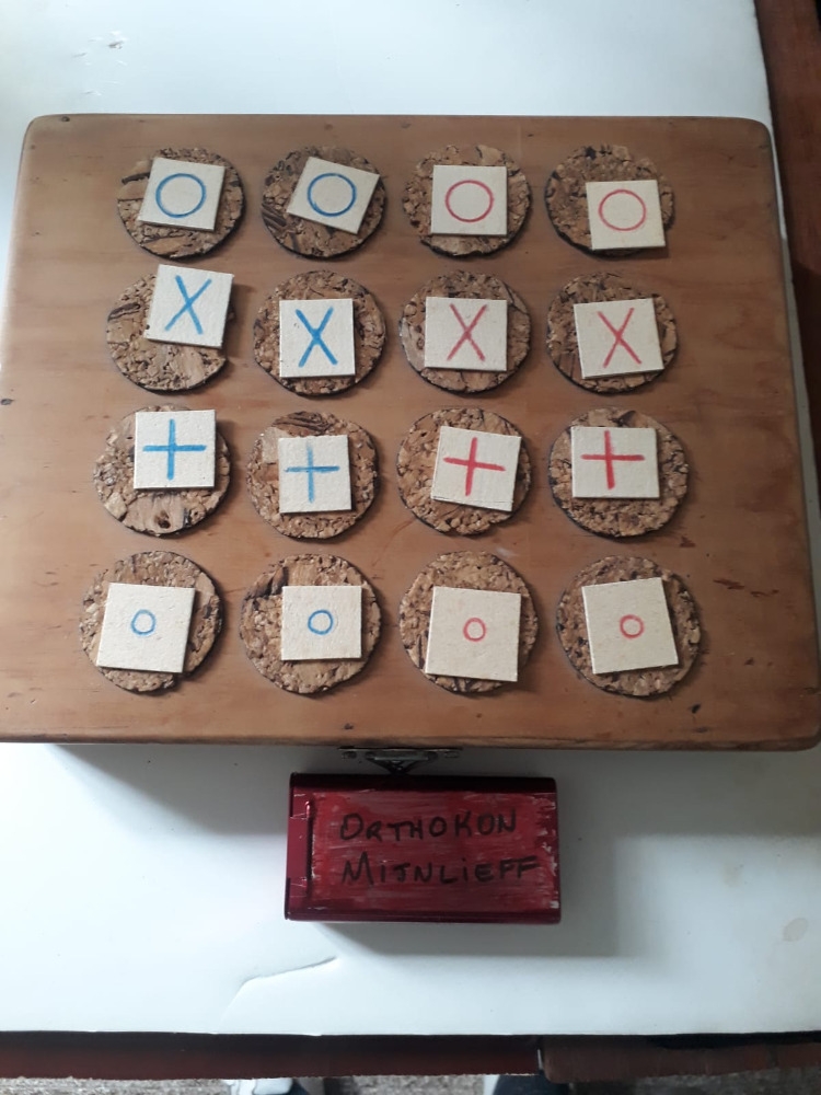 Tabuleiro formado por 4 seções 2x2 e 8 peças para cada jogador sendo duas de cada tipo. Os tipos são: [+] que permite o adversário a colocar peças na vertical e diagonal, [x] que permite os adversários a colocar peças nas diagonais, [o] que permite o adversário a colocar suas peças próxima à peça colocada e [O] que permite o adversário a colocar suas peças distantes da última peça