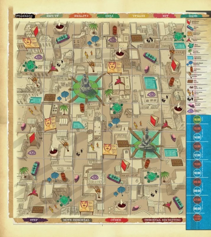 Em Mind MGMT: The Psychic Espionage "Game.", Um jogador controla Mind MGMT e deve vasculhar a cidade em busca de novos recrutas. Eles se movem em um mapa secreto, tentando visitar locais que correspondam a uma de suas três cartas de características sorteadas aleatoriamente. Eles também podem usar seus quatro Imortais para proteger os locais de serem expostos.