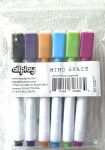 Os dados são roxos, laranja, rosa, azuis e verdes. Os marcadores vêm nas mesmas cores, além de preto.