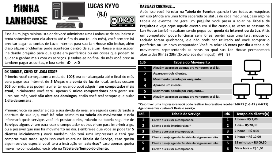 Você é dono de uma Lan House do seu bairro, e precisa administra-la.Esse é um jogo minimalista onde você administra uma Lanhouse de seu bairro e tenta sobreviver com ela aberta até o fim do ano (ou do mês), você sempre irá precisar pagar as contas de Luz e Internet para sua Lan House não fechar, além disso alguns problemas pode acontecer dentro de sua Lan House e isso acabar lhe dando prejuízo para que gaste em periféricos ou em coisas que podem te ajudar a ganhar mais com os serviços ..(Lembre se no final do mês você precisa também pagar as contas, e boa sorte!