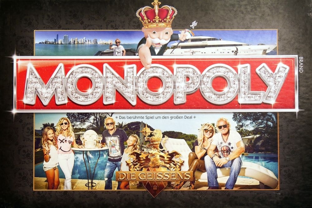 Mais uma edição do clássico jogo Banco Imobiliário com tema de personagens e lugares de 'Die Geissens', milionários que se fizeram sozinhos. Ele inclui uma variante para substituir a regra "rolar duas vezes novamente" por