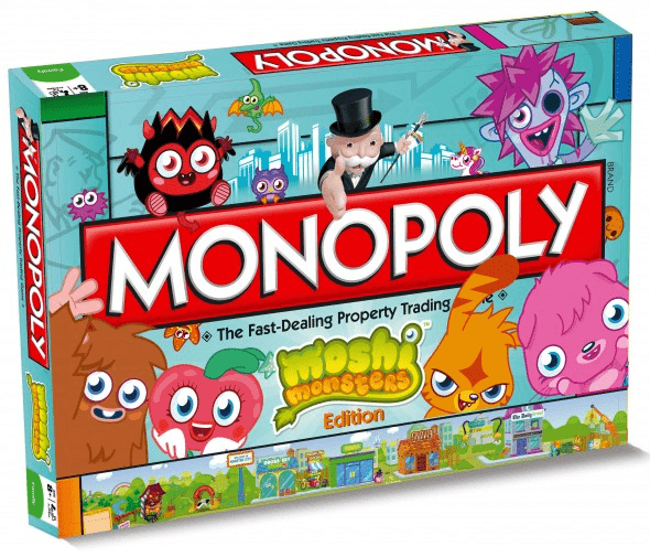 O clássico Monopoly com construções e outros elementos de Moshi Monsters, um jogo online para crianças.