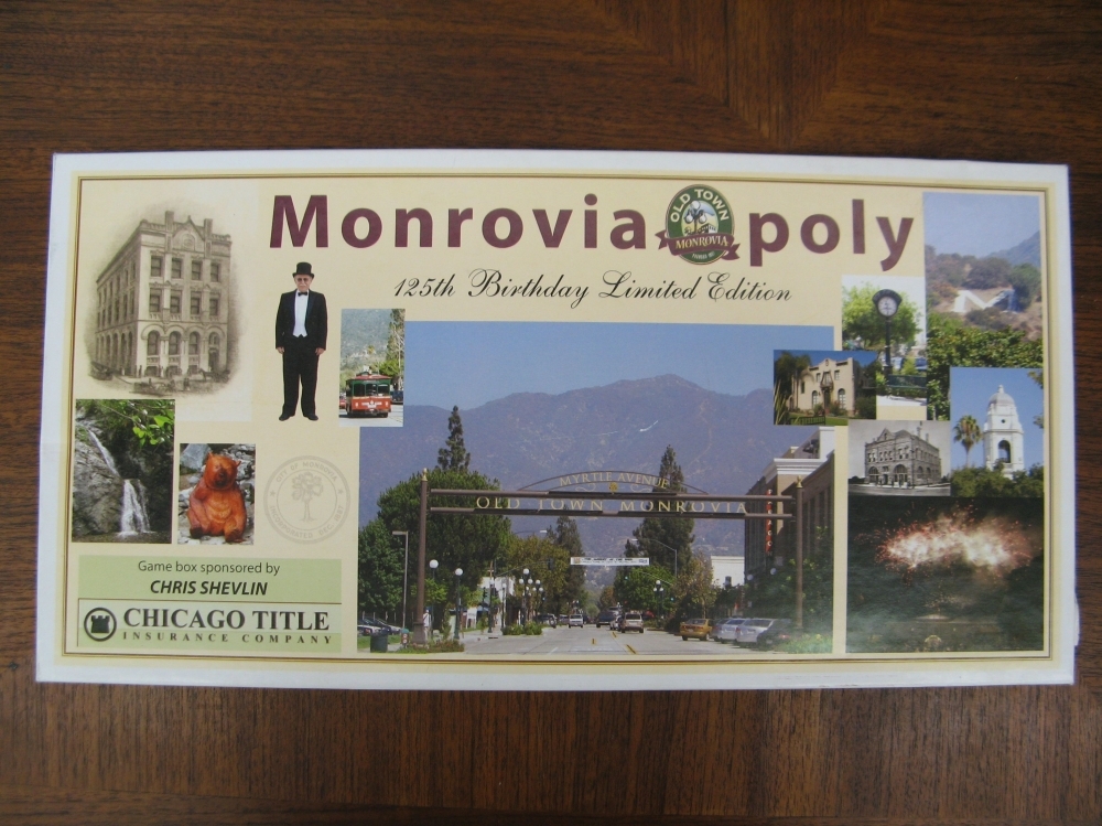 Monroviaopoly é um clone de Monopoly com tema de cidade com um tema de Monrovia, Califórnia. Os espaços no quadro representam empresas e pontos de referência locais.