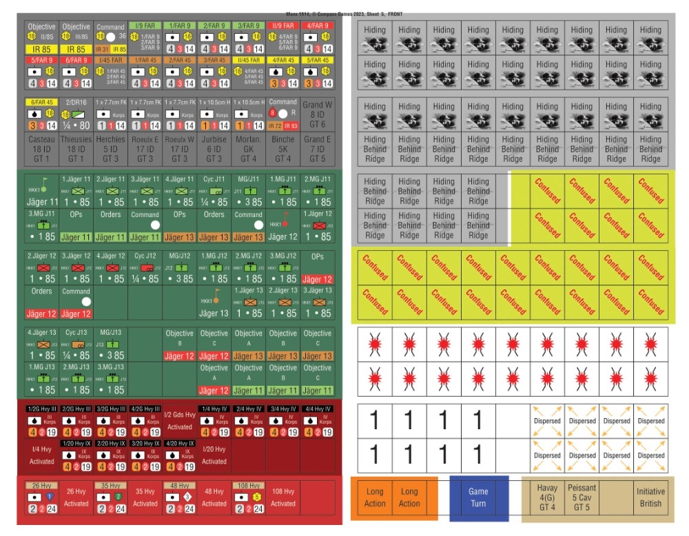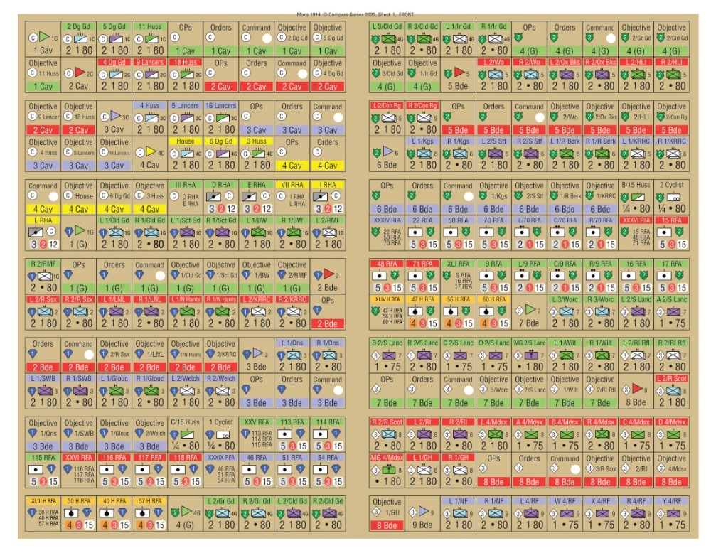 Mons é um grande jogo. Dois mapas mostram a extensão do Canal Condé. Os 1.500 counters têm todas as unidades do BEF e do 1. Armee Alemão. As unidades são meio batalhões e baterias com alguns piquetes de pelotão. Mons tem muitos cenários: três cenários de treinamento, o cenário histórico completo de dois mapas, vários cenários menores de um mapa e um conjunto de encontros hipotéticos muito interessantes. Nos cenários de engajamento de reunião, os exércitos entram gradualmente, liderados por suas divisões de cavalaria. Um período selvagem de manobra se segue enquanto a cavalaria e os jägers tentam passar furtivamente pelo inimigo até que a infantaria apareça e a batalha seja travada para valer. Existem regras para ataques de cavalaria, incluindo desastres e ataques impetuosos. Os problemas de comando do BEF e German 1. Armee são mostrados, embora as variantes de cenário dêem aos jogadores toda a liberdade que eles poderiam desejar.