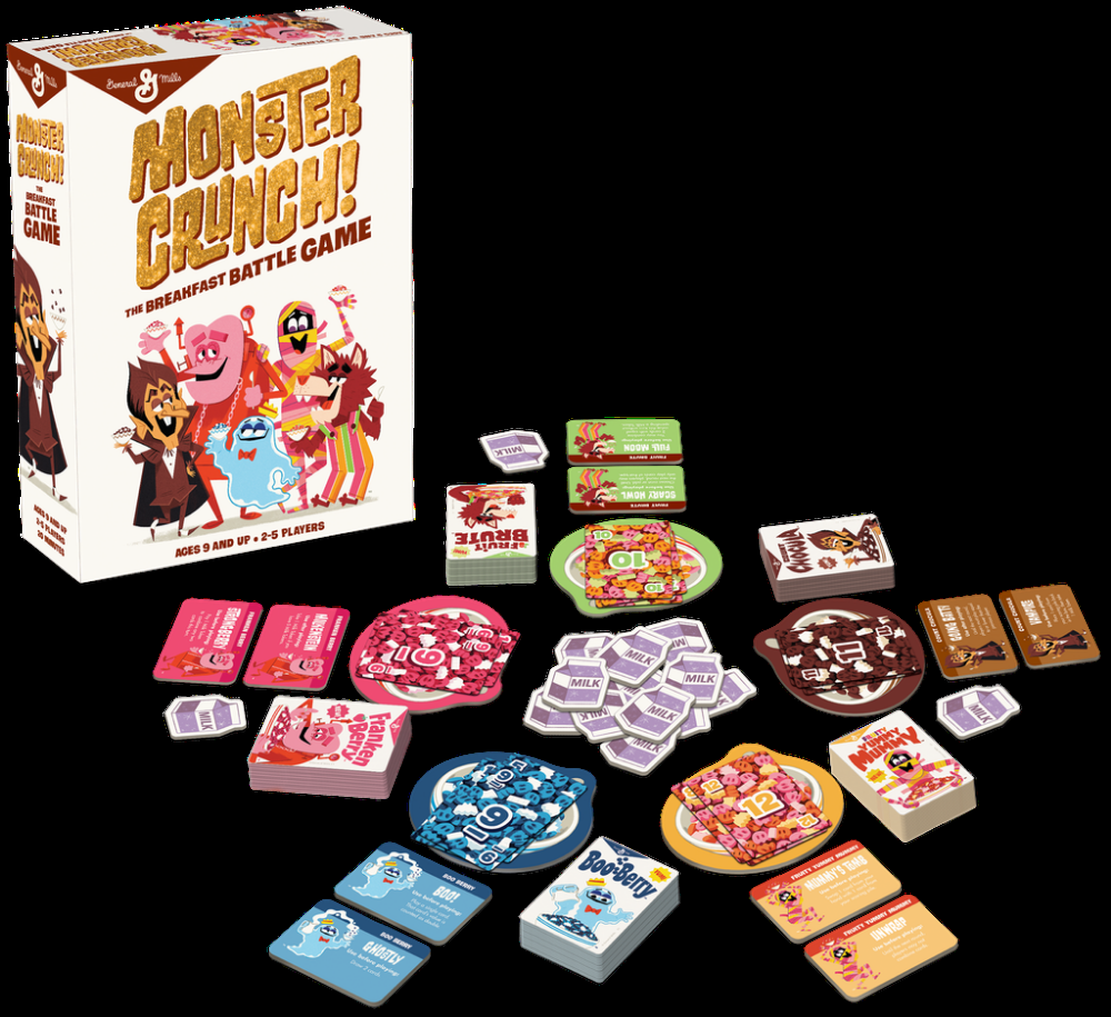Neste jogo rápido de sorte e estratégia, os jogadores colecionam tantas Cereal Cards em suas taças quanto possível. Cada monstro tem poderes especiais para lhe dar uma vantagem e ajudá-lo a devorar o maior número de cereais. Use Tokens de leite para combinar cartões de cereais e mordidas maiores. O personagem Monster Cereal que mais comer ganha o jogo!