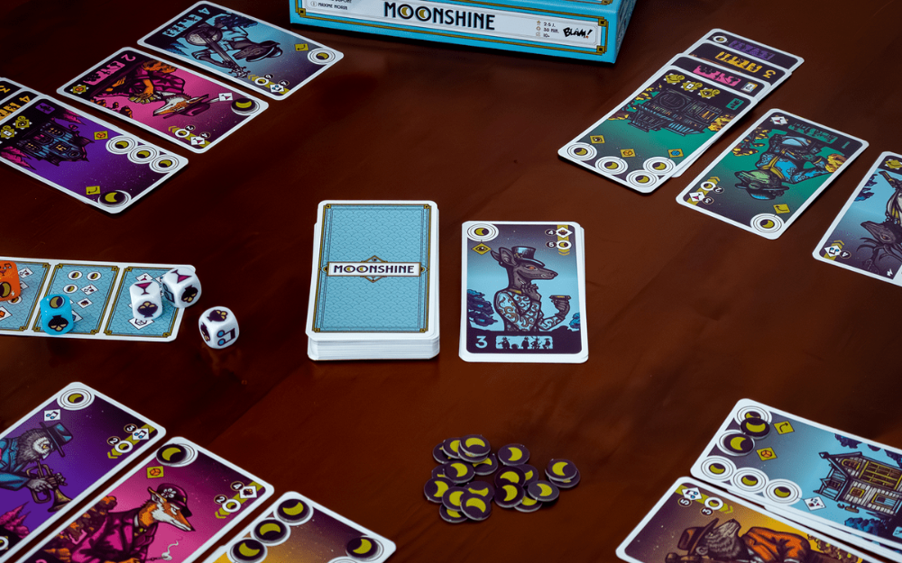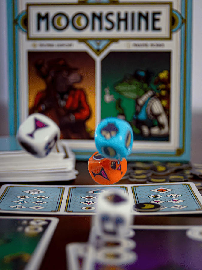 Moonshine é um jogo de construção de motor baseado em dados, no qual os jogadores jogam simultaneamente. Em cada turno, todos os jogadores aproveitam os resultados dos dados obtidos pelo jogador ativo para seus próprios objetivos, com o intuito de aumentar o apelo de seu bar clandestino. O objetivo do jogo é atrair clientes suficientes para alcançar 12 pontos de prestígio. Quando um jogador atinge essa marca, a partida termina e o jogador com a maior pontuação vence.