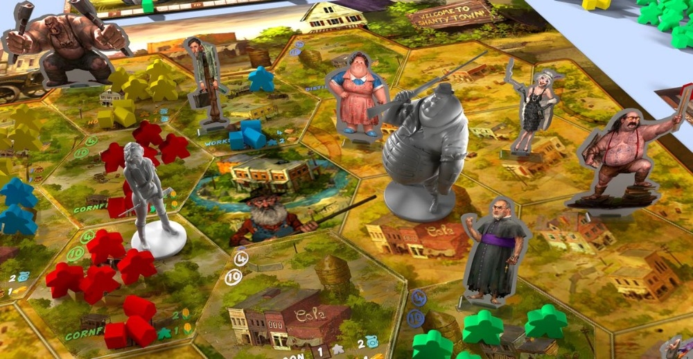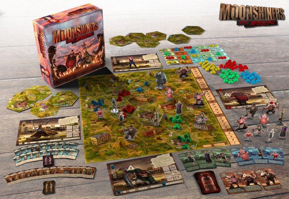 Moonshiners of the Apocalypse é um jogo moralmente questionável, não cooperativo de construção de cidades, 4x para 2-4 jogadores, com um pouco de combate de dados. Em outras palavras, Moonshiners é o único jogo de que você precisa ficar longe se você se preocupar com humor negro, escolhas moralmente questionáveis ​​e beber com seus inimigos até que eles desmaiem.