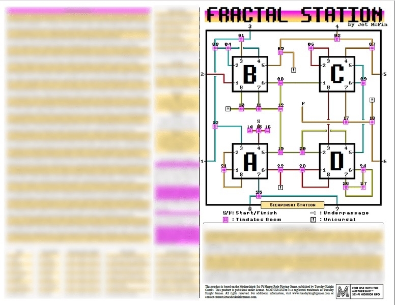 Este é um módulo de página única, frente e verso para o RPG de terror de ficção científica, Mothership (embora possa ser hackeado em outros jogos do tipo OSR). Os arquivos opcionais incluem um mapa maior da estação, prova de solubilidade e uma versão mais antiga do mapa com estações aninhadas como auxílio visual de como as salas de recursão funcionam.