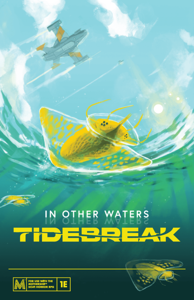 In Other Waters: Tidebreak é uma aventura de exploração subaquática para o jogo Mothership Sci-Fi Horror Roleplaying Game. Baseado no premiado videogame 2020 da Jump Over the Age, Tidebreak oferece a oportunidade de explorar o mundo pantalásico de Gliese 667Cc.