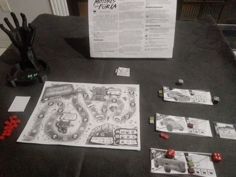 Motores em Fúria é um jogo de tabuleiro de 3 páginas print-n-play para 1 a 3 jogadores. Você é um piloto de corrida de carros em um mundo pós-apocalíptico e selvagem.