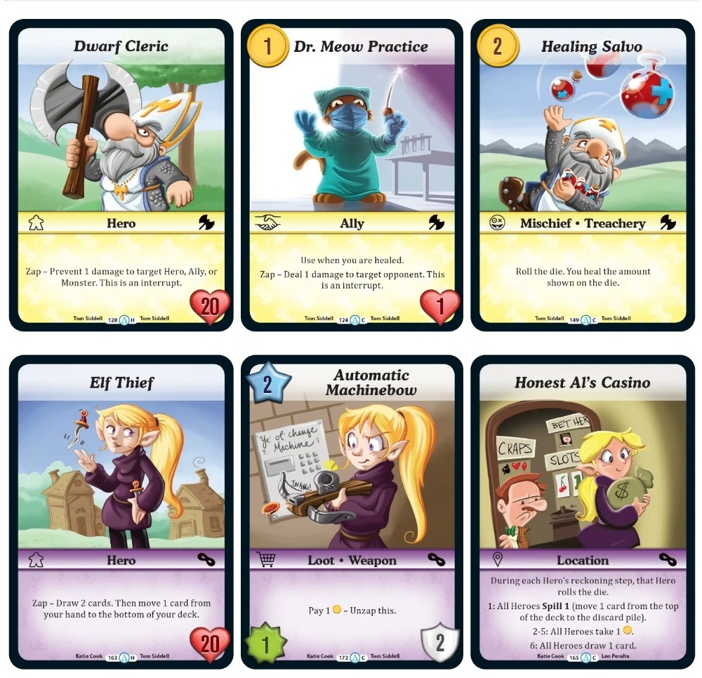 O Cleric & Thief Starter Set inclui dois decks de 40 cartas, tokens, discos de nível, um dado de seis lados, regras de início rápido e duas cartas de Heroi. O clérigo anão ri na face da dor enquanto ele se cura, turno após turno, mas o Elfo Ladrão engana e rouba a maior frequência possível ... e ser pego fazendo trapaça às vezes é parte do seu plano!