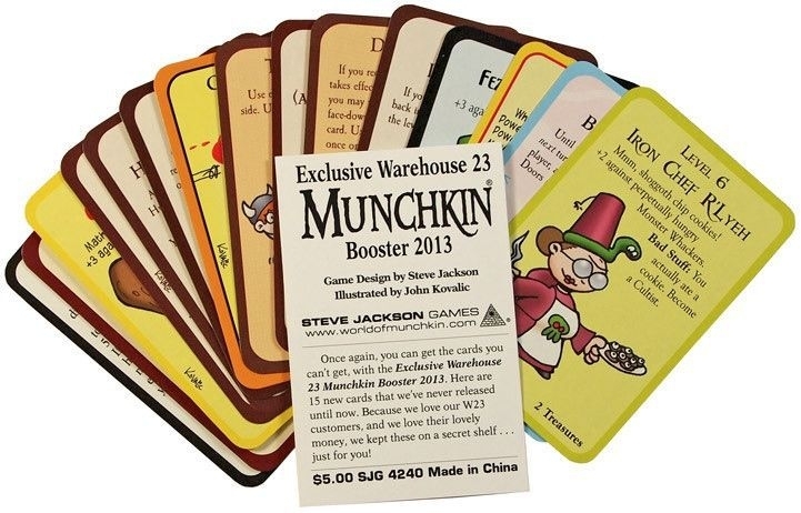 O Exclusive Warehouse 23 Munchkin Booster é perfeitamente descrito pelo nome: um conjunto fixo de cartas para os vários jogos Munchkin vendidos exclusivamente através da loja varejista da editora Steve Jackson Games, também conhecida como Warehouse 23. Um booster foi lançado anualmente entre 2010 e 2014, e em 2016, a Steve Jackson Games relançou todas as cartas Munchkin de tamanho padrão desses boosters como Munchkin Hidden Treasures.