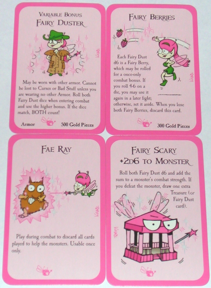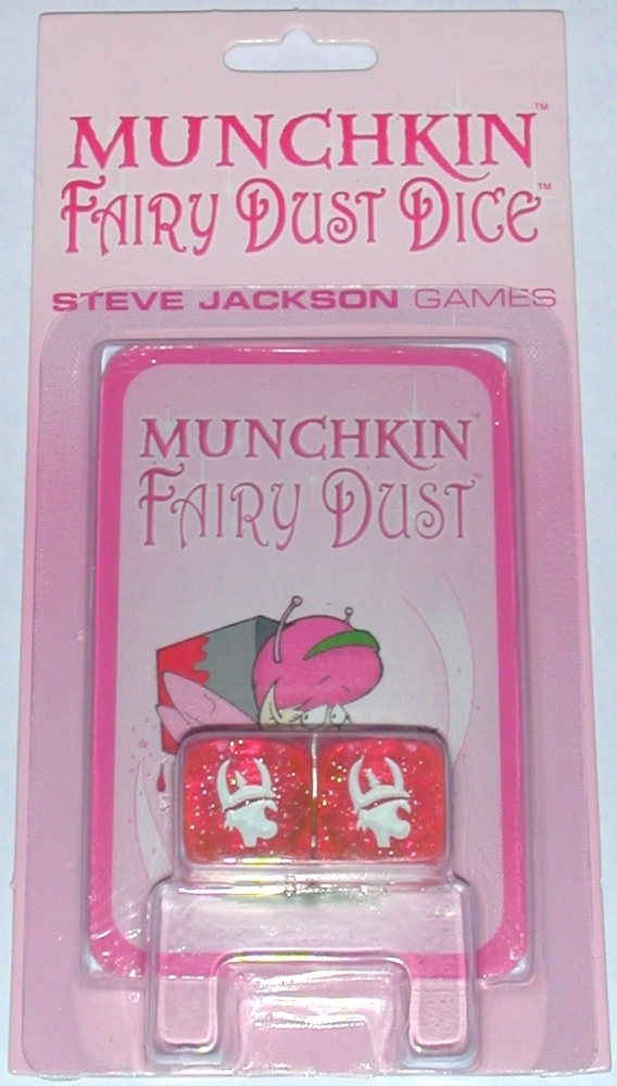 Munchkin Fairy Dust Dice é uma expansão temática do booster Munchkin: Fairy Dust booster para Munchkin - com os jogadores sendo recompensados por ajudar os outros jogadores - mas ele pode ser usado com qualquer um dos inúmeros jogos de Munchkin. Munchkin Fairy Dust Dice inclui dois dados rosa brilhante e quatro novas cartas rosas de fadas.