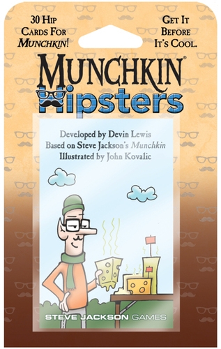 Munchkin Hipsters acrescenta trinta novas cartas a qualquer jogo base de Munchkin e que permite desafiar O Homem, vestindo seu Boné de Malha e bebericando seu Nonfat Soy No-Whip Skybby Half-Caf Fair Trade Ventitre Mocha Latte. Mesmo que seja algo tão ano passado, você pode lutar contra a Banda Indie usando seus artesanais Óculos Escuros de Aro Grosso e subir um nível quando você Rejeita o Convencional.