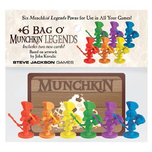 Munchkin: +6 Bag O' Munchkin Legends vem com duas novas cartas de Munchkin, bem como seis peões Munchkin em seis cores: vermelho, laranja, amarelo, verde, azul e roxo.