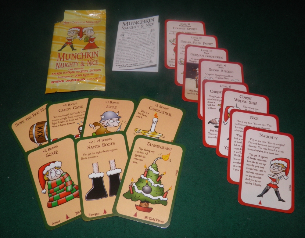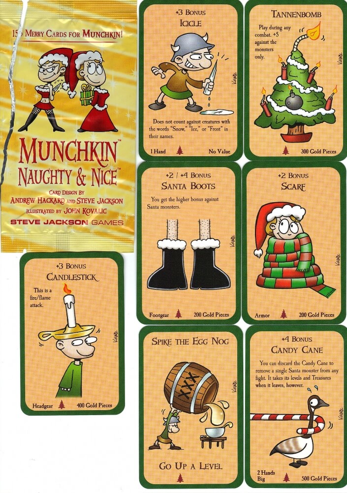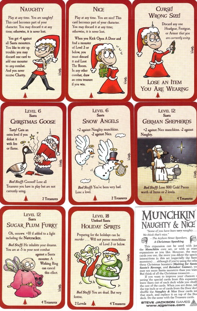 Munchkin Naughty & Nice, a quarta expansão contém 15 cartas com temas natalinos. Agora os jogadores podem usar o "Candy Cane" e "Tannenbomb" para combater os "Snow Angels" e "Holiday Spirits"! "Spike the Egg Nog" para subir de nível! Seja "impertinente" ou "agradável" ... ou ambos ao mesmo tempo!