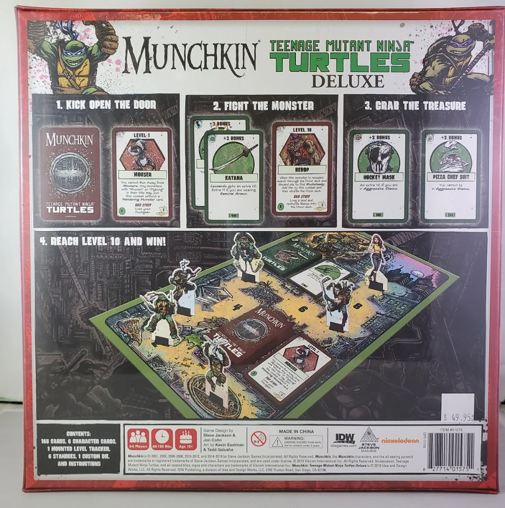 Baseado nos quadrinhos inspiradores de várias gerações do Teenage Mutant Ninja Turtles e no original Munchkin da Steve Jackson Games, Munchkin: Teenage Mutant Ninja Turtles foi desenvolvido por Jon Cohn com arte do lendário artista e criador do TMNT, Kevin Eastman.