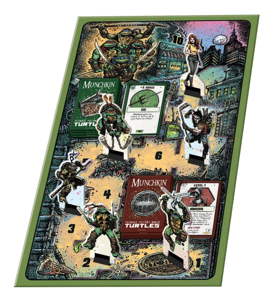 Munchkin: Teenage Mutant Ninja Turtles coloca você no papel das Tartarugas para se unir e lutar contra o mal! Este jogo pega o estilo ninja do TMNT e combina-o com o jogo de exploração de masmorras de Munchkin! Jogue como Leonardo, Donatello, Michelangelo e Raphael junto com April O'Neil e Casey Jones para enfrentar Shredder, Krang e ainda mais, enquanto você corre para o nível 10!