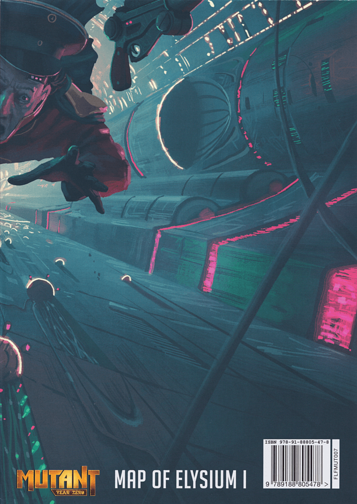 Um mapa de pôster dobrado de 4 painéis do enclave Elysium I, com a arte da capa do Mutante: Elysium no verso.