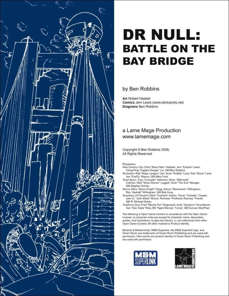 Dr Null: Battle on the Bay Bridge é uma prequela de Day of Dr Null, uma aventura M&M Second Edition Superlink da Lame Mage Productions. Este breve cenário tem como objetivo apresentar o Dr Null aos heróis e preparar o cenário para a aventura posterior, mas pode ser jogado como um jogo independente, mesmo se você não executar o Day of Dr Null.