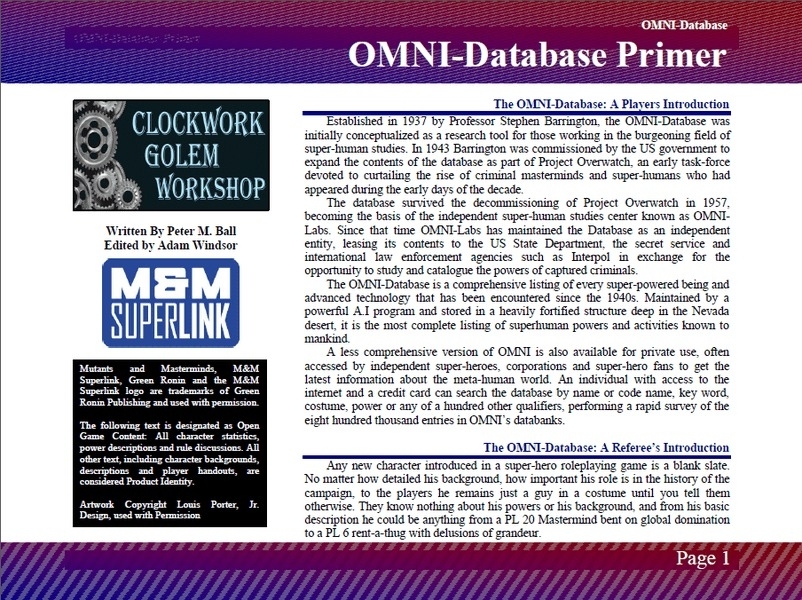 Estabelecido em 1937 pelo Professor Stephen Barrington, o OMNI-Database foi inicialmente concebido como uma ferramenta de pesquisa para aqueles que trabalham no campo florescente dos estudos sobre-humanos. Em 1943, Barrington foi contratado pelo governo dos EUA para expandir o conteúdo da base de dados como parte do Project Overwatch, um grupo de trabalho inicial dedicado a reduzir a ascensão de génios criminosos e super-humanos que apareceram durante os primeiros dias da década.