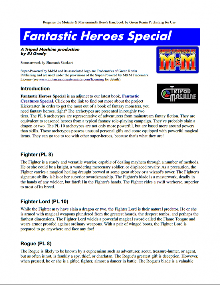 "Meu nome é RJ Grady e criei a Tripod Machine. Fantastic Creatures Special é um livro que pega criaturas clássicas de fantasia e as traduz, mecanicamente e tematicamente, para o gênero de super-heróis de histórias em quadrinhos. Este livro será divertido, versátil e, Esperamos que seja inspirador. Minha visão é combinar escrita de jogos de primeira classe com arte atraente para oferecer a você um produto de RPG de mesa premium. O Fantastic Creatures Special será publicado com orgulho sob a licença Super-Powered by M&M."