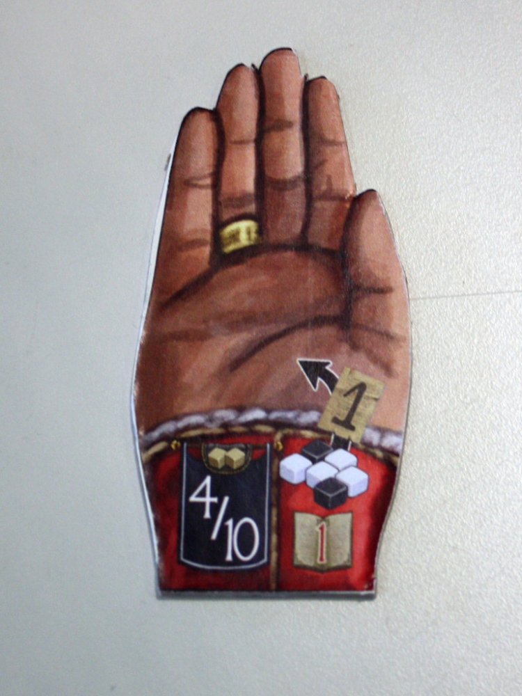 Marcador de primeiro jogador apresentado na na feira SpieleWahnsinn Herne 2015. Foto por Thorin2001 do BGG.