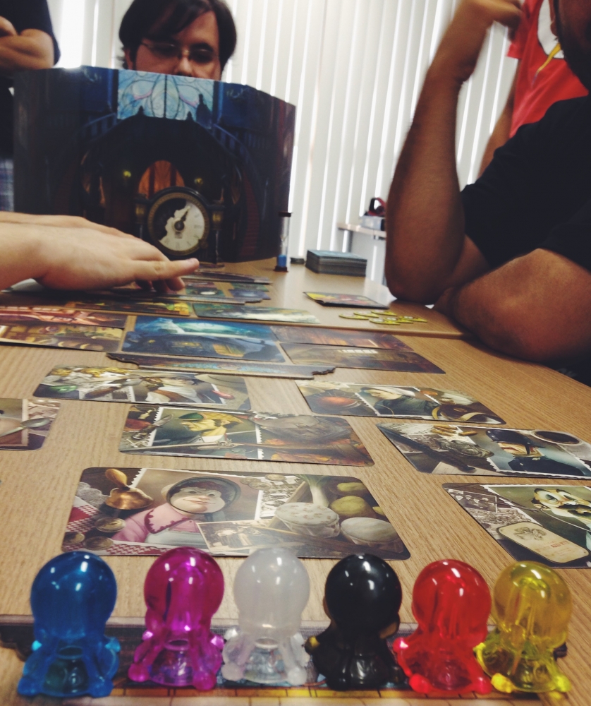 Vislumbre do setup para uma partida com 7 jogadores (com o "fantasma" ao fundo) – Oficina Lúdica, Natal/RN