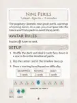 Um jogo solo com informações limitadas e antecipação do futuro para evitar nove desastres usando o baralho Mysticana. Usando sua mão de cartas (com base na dificuldade escolhida), jogue contra a linha do tempo central de 9 cartas de perigo. A cada turno, você vira uma das cartas de perigo na linha do tempo com a face para cima, compra uma nova carta para sua mão e, em seguida, joga uma carta da sua mão em um espaço livre em uma fileira separada abaixo de qualquer carta de perigo. Após 9 turnos, compare a classificação e o elemento de cada perigo com a classificação e o elemento da carta adjacente. Cada um dos perigos deve ser superado com sucesso para vencer!