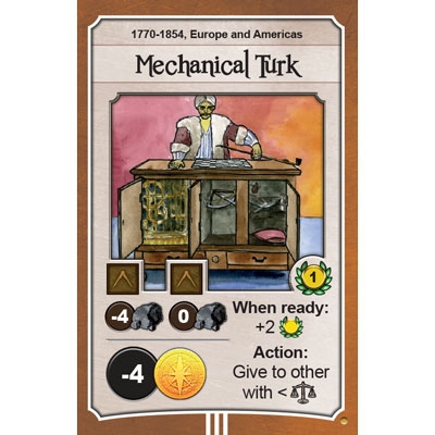 Mechanical Turk deve ser misturada com as cartas da terceira era, então comprada e construída como qualquer outra maravilha usando arquitetos e pedra. É recomendável incluir esta carta apenas quando houver jogado algumas vezes com o deck avançado.