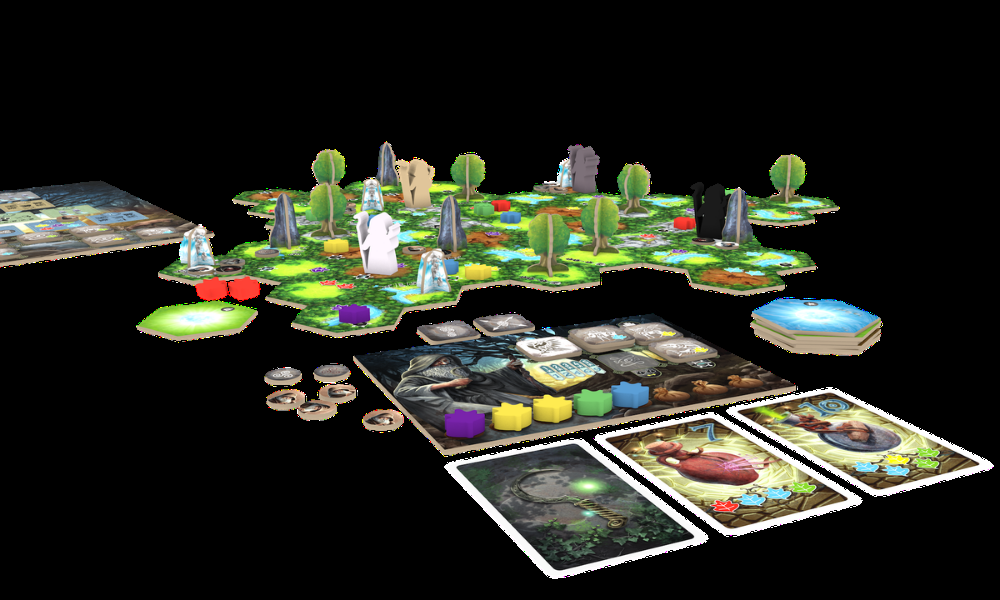 Se ele quiser, o druida pode usar uma planta sagrada, a planta de arcanjos, para se transformar em um corvo e voar para qualquer tile de "Carvalho" no tabuleiro. Ele pode invocar o espírito de um animal para obter seus poderes especiais e depois usá-los durante um movimento especial (trocar um recurso, encontrar um atalho, etc.)