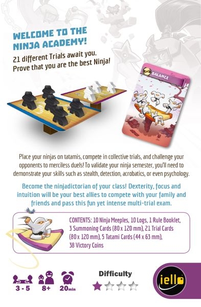 Seu treinamento alterna testes e duelos coletivos, em uma série de testes variados comprados aleatoriamente. Esteja você desafiando todo o grupo ou cara-a-cara com outro ninja, haverá apenas uma regra: seja o melhor em seu julgamento! Por exemplo, tente ser o primeiro jogador a colocar um míssil Ninja em cada um dos dedos! Tente adivinhar quantos ninjas seu oponente colocou na caixa apenas sacudindo! Seja o mais rápido para montar 5 toras de madeira verticalmente! Seja forte o suficiente para acumular pontos dependendo do seu placar, mas também seja estratégico o suficiente quando você apostar no vencedor de cada duelo! Ninja Academy é um novo jogo de destreza hilário, acelerado e altamente rejogável!