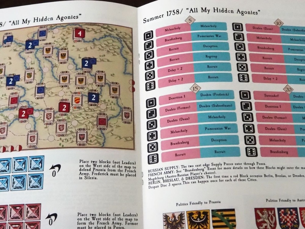 As campanhas do período são propensas a todos os tipos de atrasos inesperados: mau tempo, doenças, retardatários, até mesmo a distração de um castelo agradável onde um comandante cansado pode demorar talvez um pouco mais do que deveria. Após cada turno prussiano, um dado é rolado para determinar quanto tempo passa. Talvez você tenha muitas oportunidades e as use bem, ou talvez você de repente perceba que o jogo está se aproximando do fim e você negligenciou perseguir seus objetivos. Essa imprevisibilidade é ainda mais complementada por uma série de tabelas de eventos específicas do cenário para cada jogador, roladas em quatro pontos-chave durante uma partida. Seus suprimentos serão atacados? As tropas entrarão na briga de outro teatro? Frederick será derrubado por suas hemorroidas ou por um ataque de melancolia chorosa?