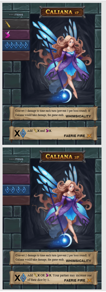 A fada Caliana é a 6ª aventureira da masmorra One Deck. Ela pode transformar dados azuis em dados amarelos ou rosa. Ela também pode curar feridas.