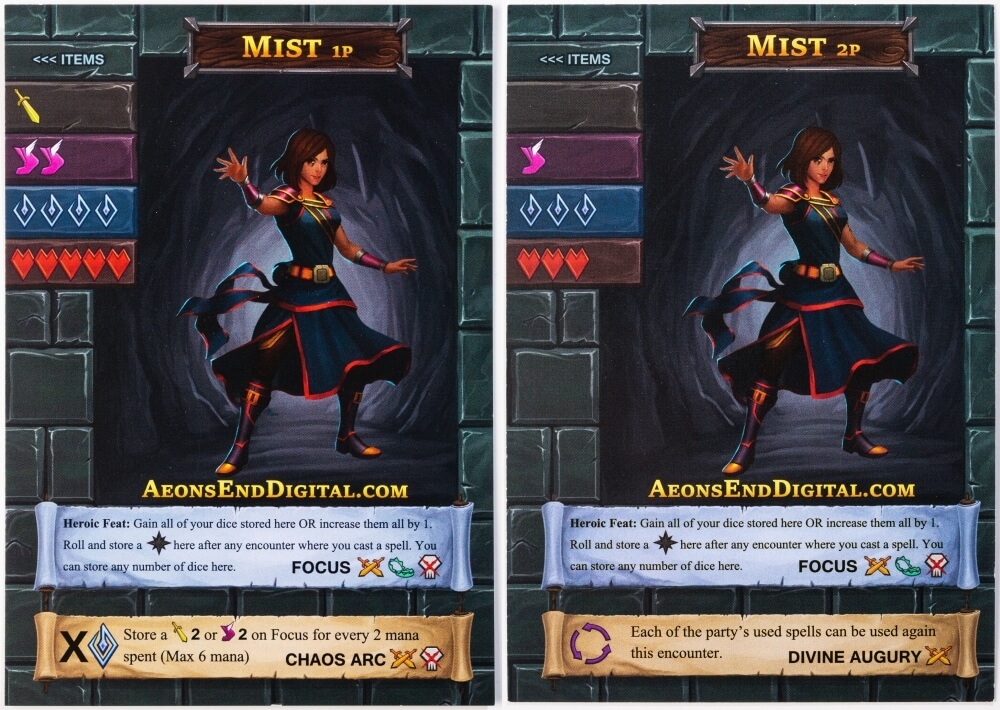 O feito heróico de Mist permite que ela aumente o poder usando feitiços. Em qualquer encontro em que você lança um feitiço, você adiciona um dado preto à carta do personagem. Durante a fase de façanha heróica, você pode aumentar todos os dados aqui em 1 ou ganhá-los todos. Isso permite que você continue aumentando o poder dos dados até que realmente precise.