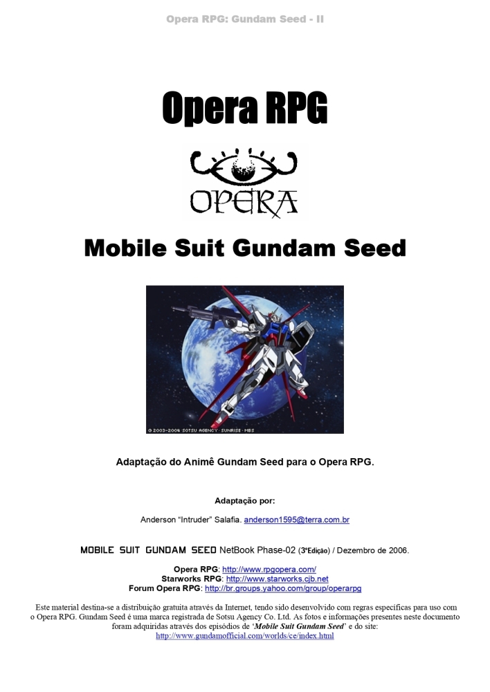 Opera RPG - Mobile Suit Gundam Seed Um clássico dos animes de Mechas com regras do OPERA RPG. Conheça a história da “Cosmic Era”, seus personagens e os poderosos Gundans. Contém regras de batalha com naves e robôs. LudoADM 50 0