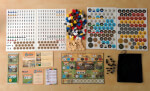 componentes para um quinto jogador: tabuleiro, peão de mercador, dez casas (postos de comércio), 7 cubos negros