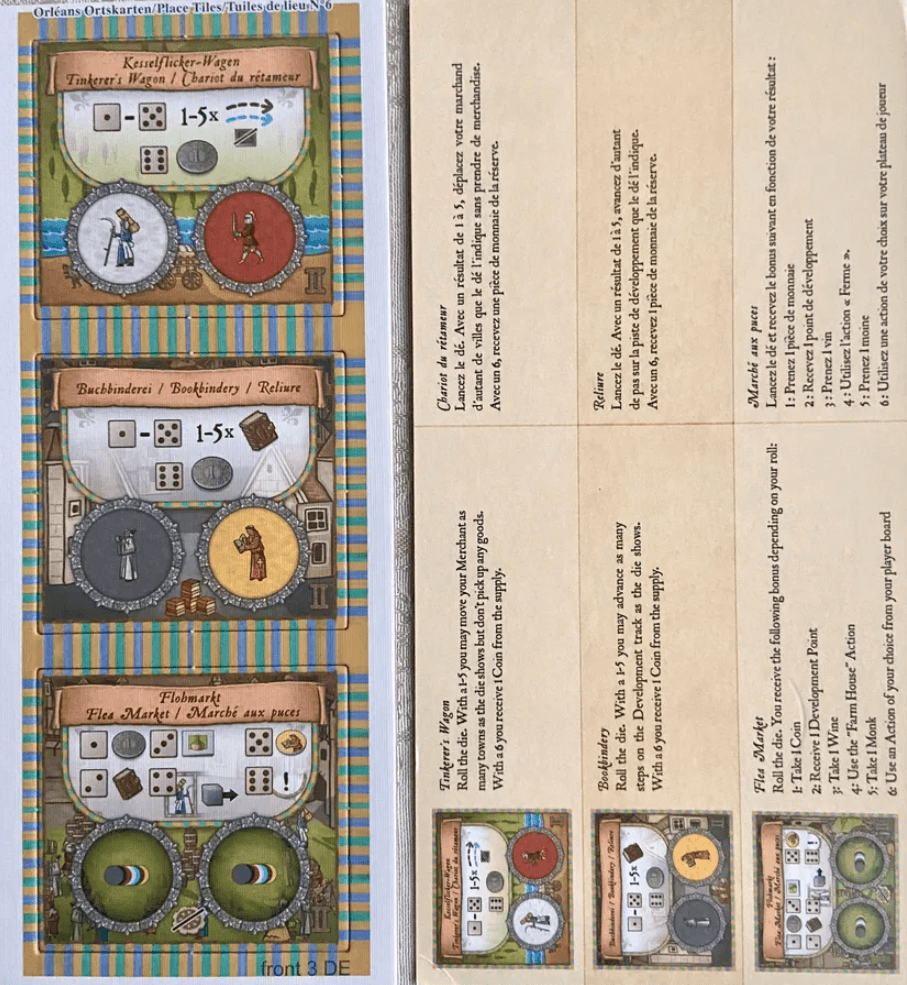 Orléans: Neue Ortskarten N°6 é um conjunto com três novas fichas de construção para uso no jogo base Orléans ou na edição de luxo do jogo. As fichas apresentam: uma carroça de artesão, uma encadernação e um mercado de pulgas.