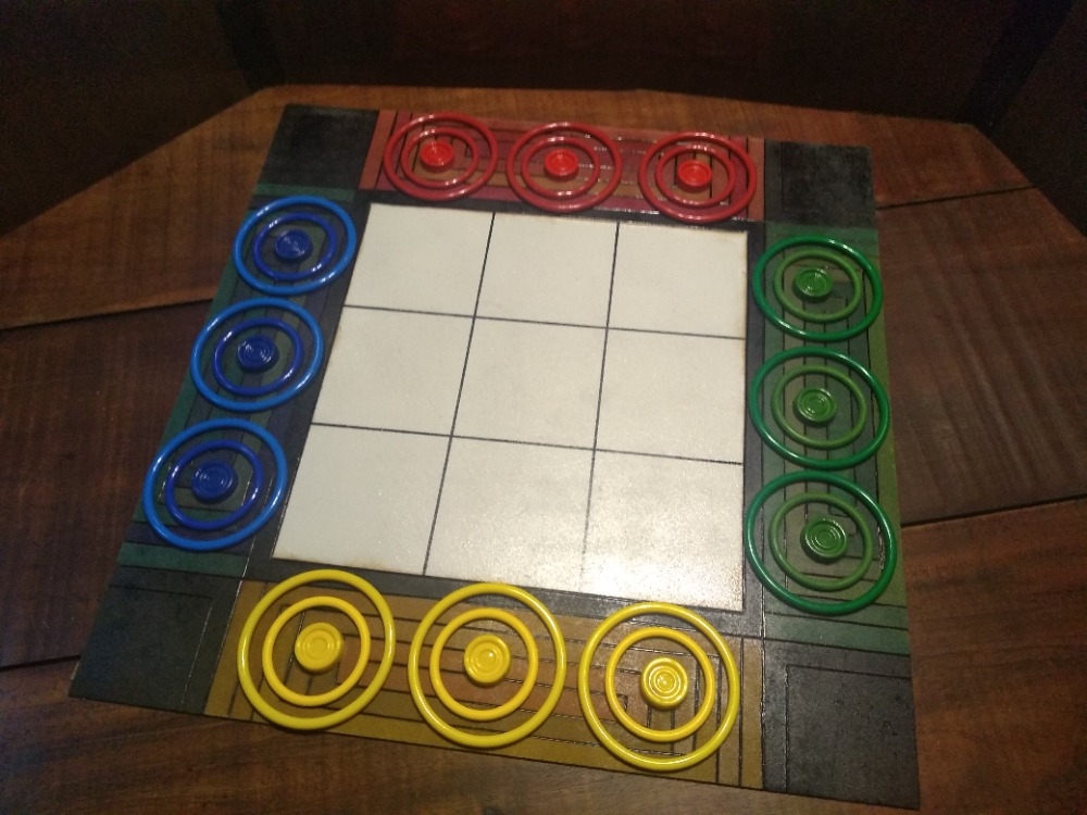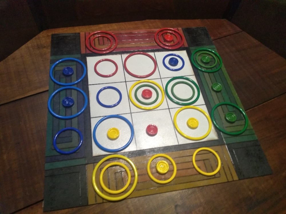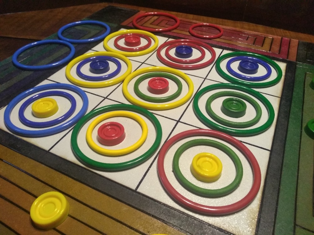 Jogado em um tabuleiro de madeira, há três maneiras de ganhar esse jogo de estratégia abstrata: consiga três círculos da sua cor seguidos em ordem ascendente ou descente; consiga peças do mesmo tamanho seguidos; ou consiga três peças concêntricas no mesmo espaço.