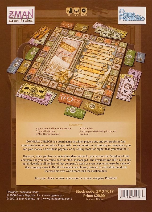 Owner`s Choice é um jogo de economia em que os jogadores compram e vendem quatro unidades da empresa e tentar ganhar dinheiro. Quando você comprar o controle de uma empresa, você se torna o presidente e pode controlar a forma como que o estoque é jogado. Ou você se tornar um investidor e pode obter uma colocação do presidente. Você escolhe em ser o presidente ou ser um investidor?