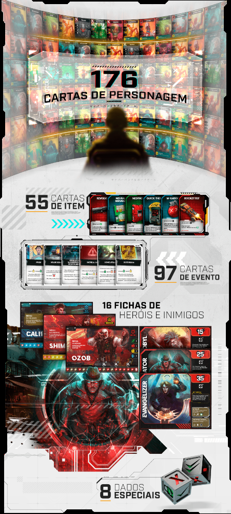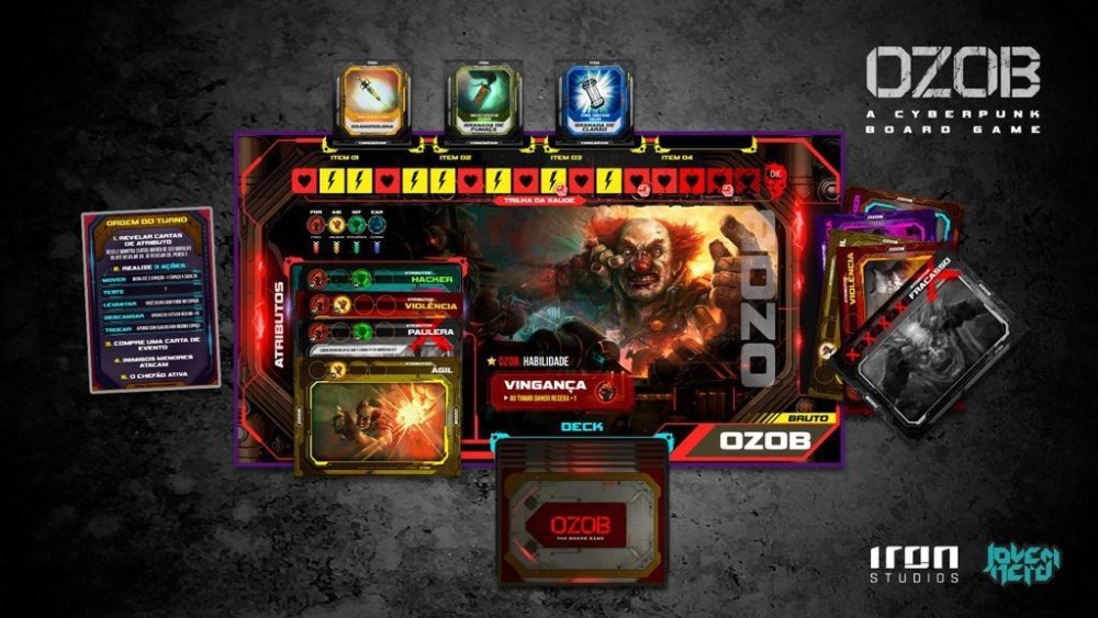 Em Ozob: A Cyberpunk Boardgame, os jogadores assumem o papel de hackers, mercenários, pós-humanos e outros rebeldes e lutam contra a opressão das megacorporações. Parta em diversas missões, com diferentes níveis de dificuldade, que podem ser jogadas de forma livre ou em modo campanha. Enfrente seguranças corporativos, policiais corruptos e robôs destruidores. Conte com seus amigos… E apenas com eles. Pois neste mundo distópico, o próprio sistema estará contra você.