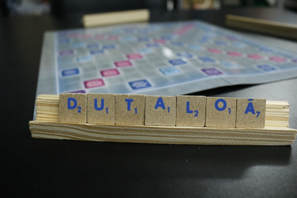 Jogo de formação de palavras cruzadas em tabuleiro.