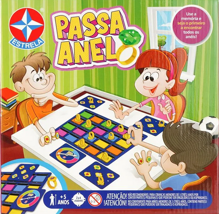 Os anéis estão espalhados nas diversas caixinhas de joias do tabuleiro, gire a roleta e escolha uma caixinha da cor sorteada. Oba! Se você achar um anel igual ao da sua cartela, ele é seu! Se não, que pena, passe a vez para o outro jogador. Quem encontrar primeiro os cinco anéis do seu tabuleiro, é o vencedor! Use a memória e seja o primeiro a achar todos os anéis!