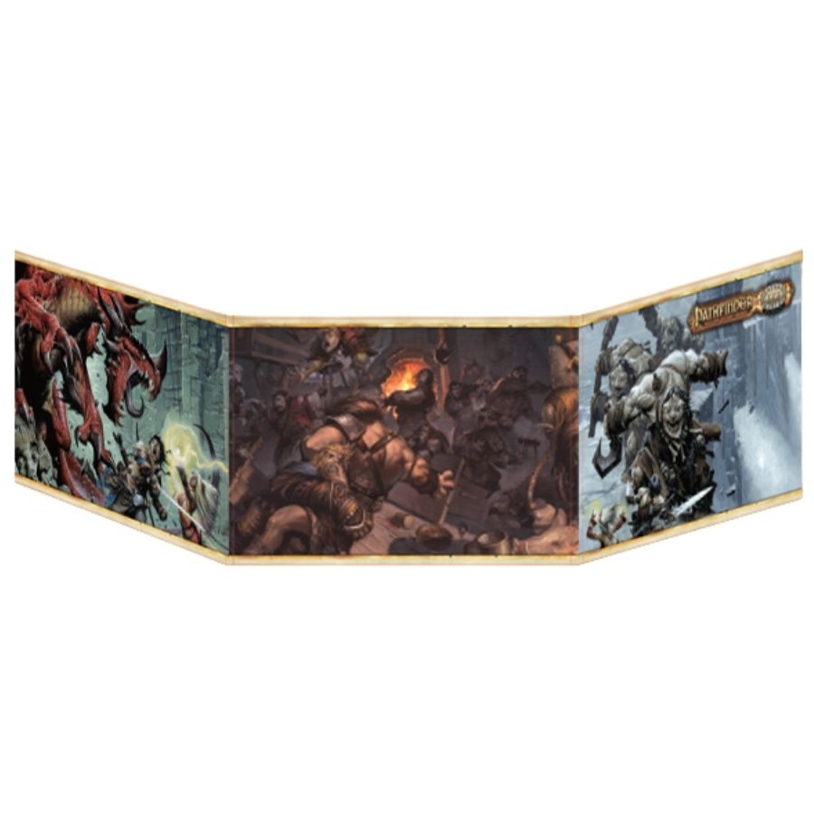 O Escudo do Mestre de Pathfinder para Savage Worlds é um painel rígido de 3 abas (cada uma com uma ilustração icônica de Pathfinder) e com todo as informações para facilitar a vida do Mestre.
