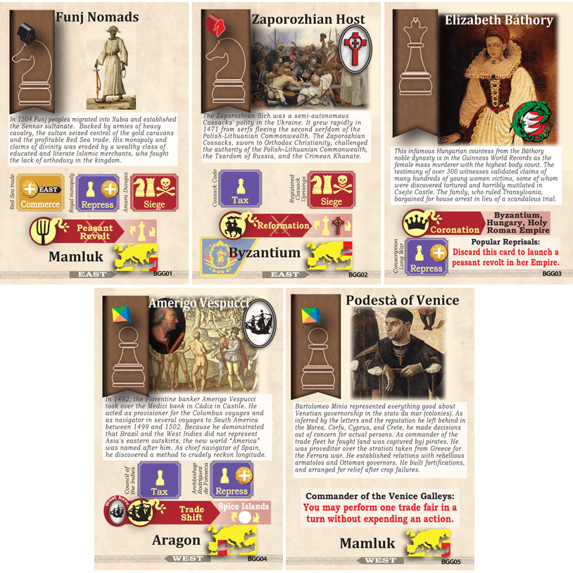 Esta expansão de 5 cartas para Pax Renaissance, projetado exclusivamente para o BGG por Phil Eklund, contém novos exploradores, nômades, cossacos e assassinos em massa da Transilvânia.