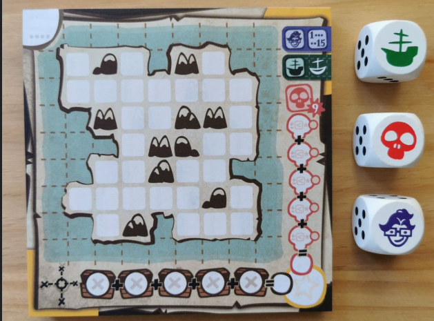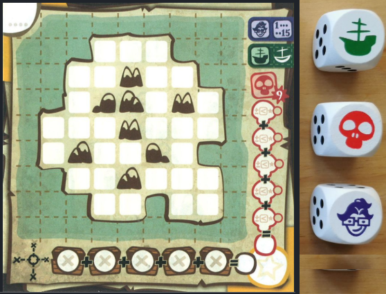 Três (3) dados de seis lados (números de 1 a 5 em todos os dados e caveira em um dos dados, Penny Papers - mulher em azul - no outro e barco no último dado);