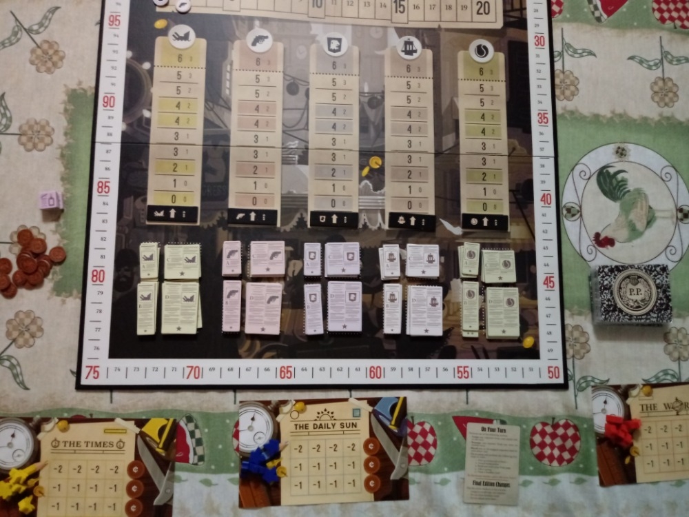 Os jogadores movem-se na pista de circulação ao longo do jogo através da publicação de jornais, e eles recebem bônus no final do jogo por melhor cobrir as cinco notícias principais. As categorias de notícias do dia são: Guerra, Crime e Calamidade, cidade de New York, Política e Condição Humana.