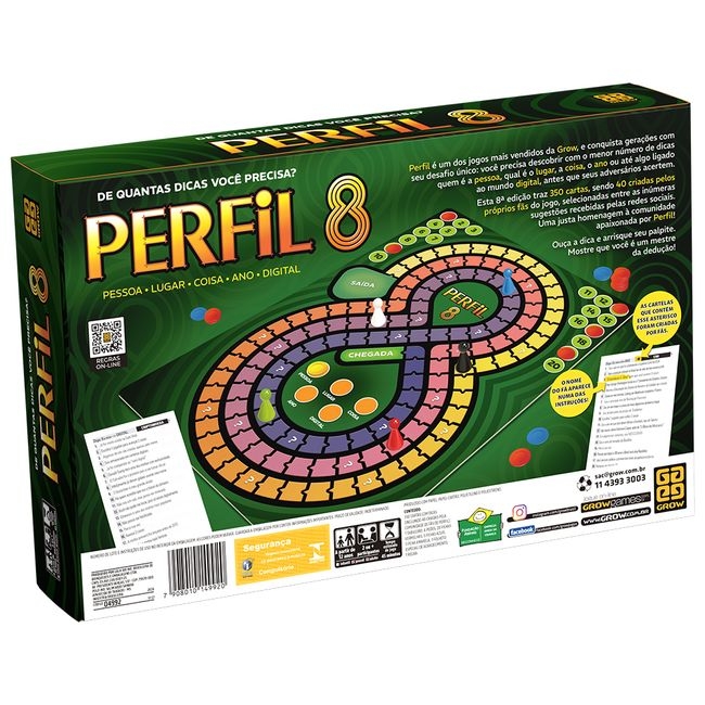 Perfil é um dos jogos mais populares da Grow, e acaba de ganhar sua tão aguardada nova edição: o Perfil 8! O desafio continua o mesmo: adivinhar com o menor número possível de dicas quem é a pessoa, qual é o lugar, o ano, o objeto ou o elemento do mundo digital, antes que os outros jogadores descubram! A grande novidade desta versão é que, dentre 350 cartas, 40 delas foram criadas pelos fãs, escolhidas entre diversas sugestões enviadas nós.