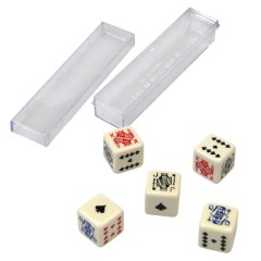 5 dados especiais com as 6 faces marcadas cada uma com, Ás, Rei, Dama, Valete, 10 de copas e 9 de espadas