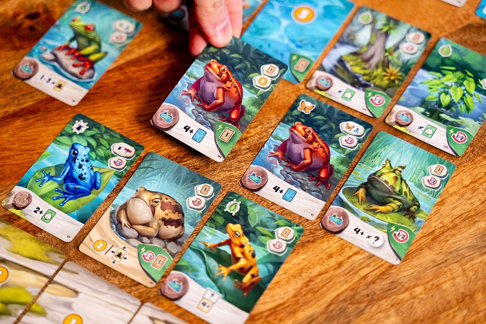 A mecânica principal envolve construção de grade e gerenciamento de cartas, com a criação do lago funcionando como um quebra-cabeça espacial. A cada rodada, os jogadores escolhem cartas de uma exibição compartilhada e adicionam uma carta ao seu lago, buscando atender condições específicas definidas pelas diferentes espécies de sapos para ganhar pontos—grupos maiores de sapos do mesmo tipo geram recompensas ainda maiores.